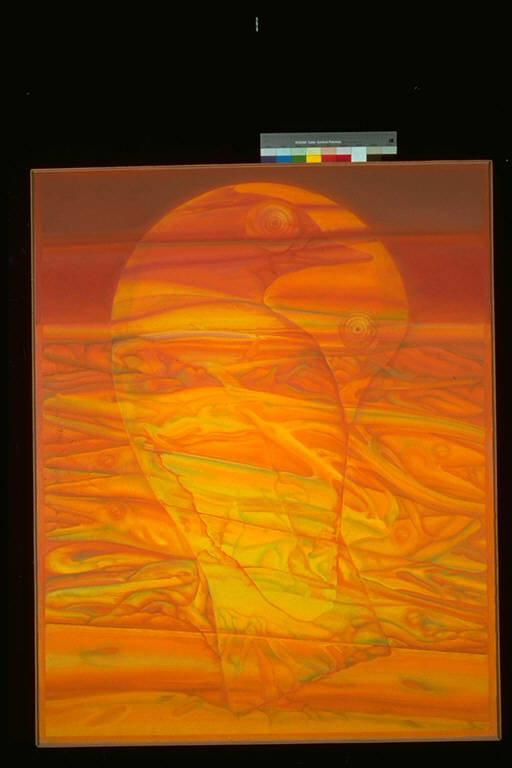 Uccello Sole. Su di un fondo indistinto, da cui emergono impronte di pesci, si staglia l'ombra di un uccello, dalla cui testa se ne diparte una seconda, reclinata