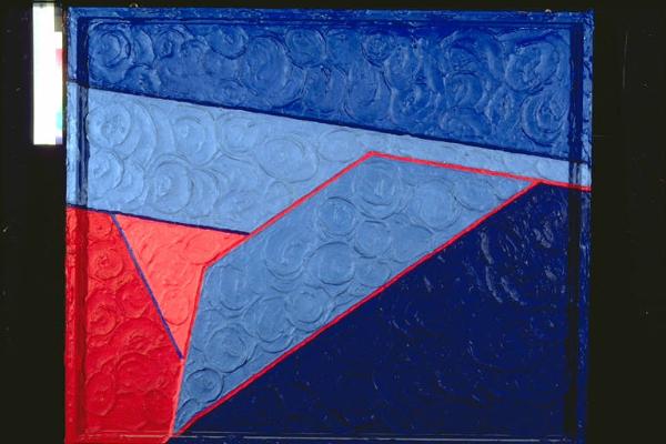 Scansioni geometriche dui toni dell'azzurro e del rosso, con elementi curvilinei in rilievo