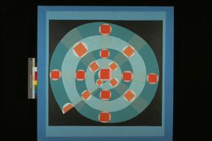 Grande elemento spiraliforme nei toni del verde acqua , con all'interno quadrati arancioni in tondi bianchi