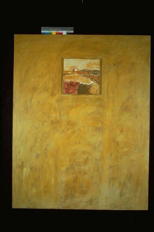 Interno giallo su quadro. Su una grande tela campita in giallo, altra tela, di piccolo formato, con paesaggio collinare e casa