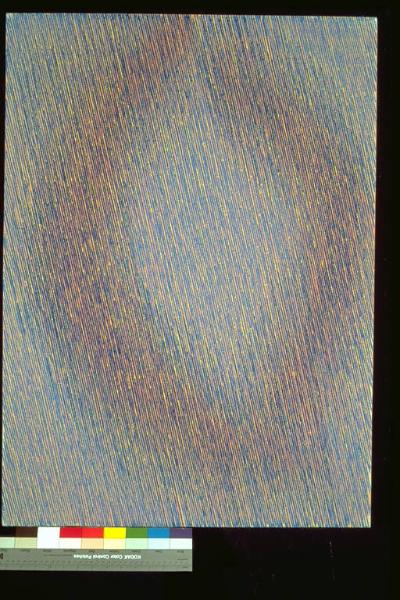 - NOTIZIE STORICO CRITICHE Da personale 1984. L'opera è costituita per modulazioni di segni, di tratti policromi, che si affiancano secondo una dinamica compositiva resa con ascensioni di colore puro, caratterizzata da mobilità interna, come in una trasformazione perenne di un elemento luminoso in un continuum. Lo spessore della luce qui si increspa al centro, produce lunghe onde di modulazione circolari, come a propagarsi anche nello spazio oltre il dipinto. E' un crescere ed un mutare ambiguo dell'immagine, tensione estrema verso una dimensione altra.\nL'artista nasce a Mantova nel 1937. Allievo del locale Istituto d'Arte continua la formazione presso l'istituto "Adolfo Venturi" di Modena, ove segue e perfeziona gli insegnamenti di Spazzapan. Frequenta brevemente il corso di scenografia all'Accademia di Brera e quello di pittura con Pompeo Borra. Si fa luce, verso la metà degli anni Sessanta, unitamente ad altri giovani artisti della "nuova visualità": Madella, Olivieri, Raciti, Schirolli, Vago. Attorno al 1967 è immerso in una strenua ed elevata concezione della definizione formale dell'opera: fatta di pittura e soltanto dipittura. La biografia dell'artista s'è via via annullata nei "travasi secreti" dell'opera: ora fulminea, ora lentssima nel precisarsi e resistere di quel suo arduo splendore.