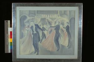 - NOTIZIE STORICO CRITICHE Da personale 1987.I modelli che l'autore presenta in quest'opera sembrano fluttuare tra reltà e sogno; la scelta è per un periodo "fin de siecle", e la composizione è dominata da un gusto decadente nella esaltazione della raffinatezza e dell'eleganza dei ballerini e dell'ambientazione. Vi è una tranquilla descrizione dei comportamenti riferiti a mode trascorse, che vengono però riproposti con una pittura eprsonalizzata, in un linguaggio che non si identifica con quello del periodo storico oggetto del recupero. L'assenza di segno in superficie immerge la rappresentazione in un'atmosfera liquida, resa per suggerimenti reali o di suggestione offerti dalla visione di caligini liquefatte, tipiche di una certa Venezia ( il cui riferimento compare anche sul retro del dipinto) , in cui la figura umana assume la vaga consistenza di un ricordo.\nL'artista nasce a Lubiana nel 1950; naturalizzato italiano, vive e lavora dal 1973 a Venezia , conseguendo il diploma in pittura all'Accademia di Belle Arti. Specializzatosi in tecniche pittoriche e grafiche, ha partecipato a corsi di perfezionamento e aggiornamento in Inghilterra, Polonia, Belgio e Francia. Ha iniziato l'attività artistica nel 1968. Dopo aver viaggiato a lungo in Europa, nel 1973 si stabilisce definitivamente a Venezia. Ha illustrato copertine e libri per numerose case editrici ed è stato invitato alla XIIa Biennale Internazionale della Grafica a Lubiana. Ha allestito numerose mostre personali e partecipato ad importanti collettive.