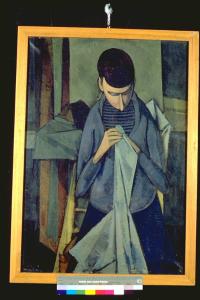 Cucitrice. Figura femminile ritratta mentre cuce un abito