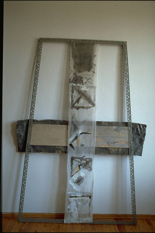 Struttura trapezioidale costituita da profilati asolati per scaffalatura Trasversalmente, una fascia in zinco; dall'alto scende un tessuto trasparente dipinto secondo modi informali