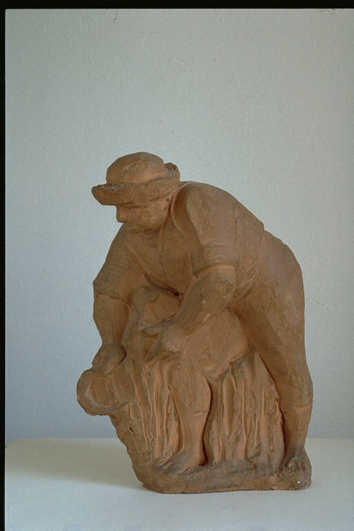 - NOTIZIE STORICO CRITICHE Al II° Premio Suzzara (1949) vinse il maiale.\nL'artista scegliendo un impianto narrativo, anzichè monumentale, si sofferma nel descrivere, con naturalezza e senza retorica, il gesto del lavoro di un contadino. L'opera quindi si inserisce a pieno titolo nell'ambito della scultura realista del secondo dopoguerra.\nL'artista nasce a Mantova nel 1913. Studia all'accademia di Brera sotto la guiiida di Francesco Messina. Nell'anteguerra frequenta lo studio di Arturo Martini a Milano. Assieme a Lucio Fontana esegue grandi cicli decorativi per la Triennale. Sempre a Milano espone assieme al gruppo del Secondo Futurismo in mostre patroncinate da Tommaso Marinelli. Frequenta il gruppo della Scuola Romana e il gruppo milanese di Corrente. A Roma realizza apparati decorativi e allestimenti scenici. Negli anni '50 dirige una galleria d'arte a Mantova. Partecipa a varie rassegne collettive internazionali. Partecipa anche a varie edizioni della Biennale di Venezia e della Quadriennale di Roma. Realizza opere per varie committenze pubbliche. Il suo stile scultoreo viene inizialmente influenzato da Marino Marini, attraversa una fase realista a fianco del gruppo del Fronte Nuovo delle Aryi, per approdare infine ad un'arte di matrice espressionista e post-surrealista.