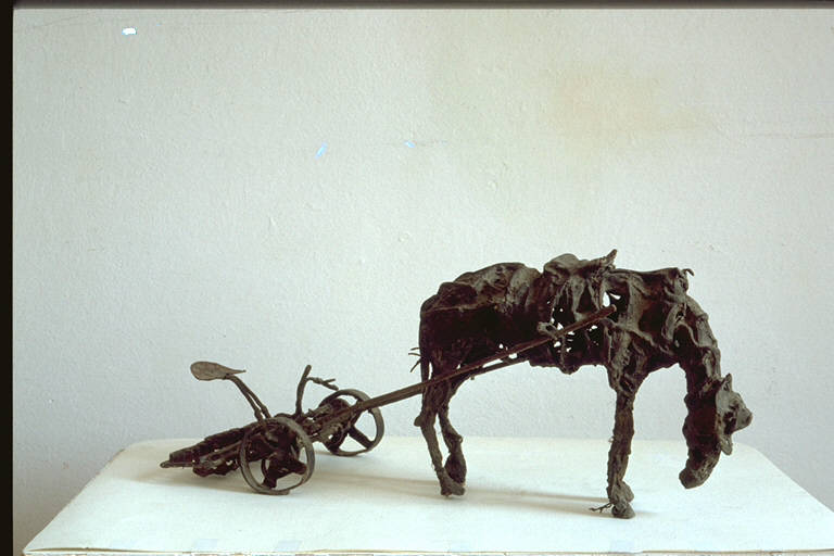- NOTIZIE STORICO CRITICHE Al VIII° Premio Suzzara (1955) vinse una forma di formaggio grana, una mortadella e una cucina da riscaldamento.\nLo scultore ha trattato la materia svuotandola e allegerendola.La superficie risulta irregolare e nodosa. Il dramma è suggerito dal tema, un cavallo chiaramente affaticato ancora legato al pesante traino, ma anche dal modo di lavorare la materia che, con il prevalere dei pieni sui vuoti e l'irregolarità della superficie, suggerisce un senso di distruzione. L'opera è inseribile nell'ambito culturale dell'esistenzialismo e della corrente estetica del realismo di matrice espressionista.\nL'artista nasce a Piovene Rocchette nel 1923. Studia a Genova e nel '42 si trasferisce a Pavia dove prosegue gli studi universitari. Nel dopoguerra parte per il centro dell'Africa. Torna in Italia nel '53 ed inizia ad esporre. Nel '54 partecipa alla X Triennale di Milano. Tra il '64 ed il '68 ricuote un enorme successo nazionale ed internazionale curando le scenografie di concerti ed opere teatrali alla Certosa di Pavia. Tra il '64 ed il '67 partecipa a numerose collettive ed allestisce personali in Italia e all'estero. Nel '68 collabora attivamente al progetto "Intervento in un centro antico": uno dei primi esempi, a livello europeo, di isola pedonale. Tra il 1980 e l'81 realizza alcune grandi sculture poi collocate a Pavia, Milano e Cesano Boscone. Nell'85 ha rappresentato la scultura italaiana a Tokyo. Ha avuto la cattedra di scultura presso la Nuova Accademia di Belle Arti di Milano.
