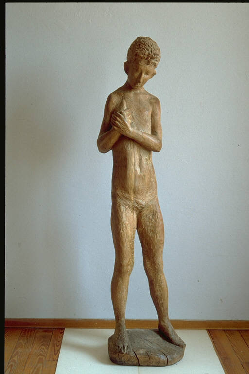 - NOTIZIE STORICO CRITICHE Al XII° Premio Suzzara (1959) fu premiato con il puledro.\nIl corpo del giovane è affusolato; le proporzioni si rastremano in corrispondenza delle spalle e del capo. Il fulcro della composizione è dato dalle mani incrociate dalle quali emerge il pesce. Sono evidenti assonanze stilistiche che vanno da Arturo Martini a Mirko.\nL'artista nasce a Falcade (Belluno) nel 1922 e vi muore nel 1987. Frequenta la scuola d'arte e in seguito stringerà amicizia con Arturo Martini, la cui frequentazione contribuirà molto alla sua formazione di scultore. Costrusce il suo studio in mezzo ad un bosco,ed esso diventerà punto di incontro tra vari artisti e uomini di cultura. Tiene mostre personali in tutta italia a partire da quella del 1953, alla Galleria Cairola di Milano; alcune delle seguenti furono a Belluno, Modena , Venezia, Roma, Treviso, Milano, Cortina D'ampezzo, Orvieto, Ferrara, Abano Terme e Mestre.