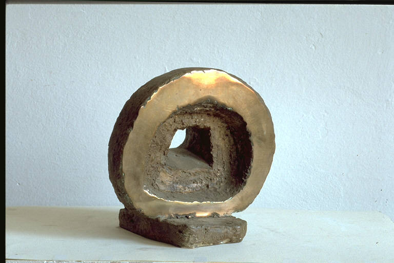 - NOTIZIE STORICO CRITICHE L'opera partecipò al XXXIV° Premio Suzzara (1994), ma non risultò tra le premiate.\nEssa è caratterizzata dalla contrapposizione fra una superficie rugosa, che risulta preminente, e una supeficie polita, lucida, che si stende unicamente nei perimetri del tondo frontale e di quello, più piccolo, retrostante. Su questi diversi trattamenti del materiale ha buona resa la luce naturale, che riesce a mettere a fuoco le più picole variazioni dei piani e che valorizza soprattutto i vuoti. Il riferimento più immediato per l'opera sono i totem, dei quali essa possiede la forza evocativa, convogliata dall'impianto strutturale solenne ed austero, che le fa assumere una sottile connotazione mistica. Luigi Salvi è nato a Bergamo nel 1920. Si è dedicato alla pittura fin dall'età giovanile, ma vi si applica con continuità dal 1945. La sua prima mostra personale è del 1970, alla Galleria Cairola di Milanmo. Seguono poi numerose esposizioni personali in città italiane come Firenze, Roma, Verona, Venezia Bologna, Ferrara, e all'estero (Strasburgo, Ginevra, Parigi). Particolarmente intensa è l'attività espositiva degli anni recenti in cui Salvi propone, oltre a tele di grandi dimensioni, anche una serie di opere scultoree realizzate in materiale refrattario e in bronzo, cui si dedica dagli inizi degli anni Ottanta.