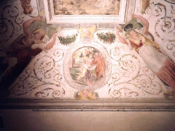 Quattro cariatidi agli angoli della volta, coi simboli delle stagioni, nelle vele quattro tondi con scene allegoriche contornati da festoni, fiori, spighe d'uva e agrumi.
