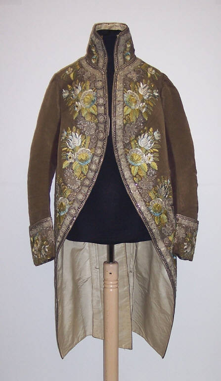 Marsina in taffetas di seta color tabacco; ricami realizzarti con filo di seta policromo, filo d'argento e canutiglia. Mezze sfere e paillettes di metallo applicate. Ricami eseguiti a punto raso, steso, lanciato, passato, piatto ed erba con motivi floreali. Taglio a redingote. Alto collo a fascetta. Mostre stondate decorate da nove bottoni e prive di asole. Punto vita ribassato ed evidenziato da due bottoni. Maniche dritte con alti paramani ricamati. Fodera in taffetas di seta avorio.