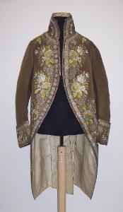 - NOTIZIE STORICO CRITICHE La marsina, che fa parte del completo da uomo composto anche dal gilet e dai calzoni, proviene da una casa privata di area veneziana. L'aspetto tipologico dichiara di buon livello la manifattura e la parte ricamata, effettuata con diverse tipologie di punto e diversi materiali.