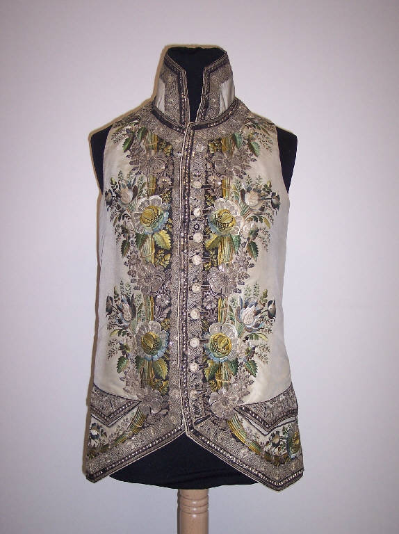 Gilet in raso di seta color avorio; alto collo a fascetta; allacciatura anteriore con nove bottoni. Il primo bottone dall'alto è privo di asola poichè ha solo funzione estetica. Modello tagliato a fianchette con faldino sul retro che termina a punta. Falde anteriori a punte aperte. Parte anteriore ricamata con filo d'argento e fili policromi a motivi floreali. Parte anteriore foderata in taffetas di seta, il fianco posteriore e il dorso sono in tela di lino color avorio.