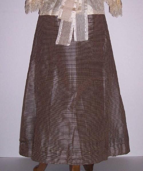 Gonna in seta a quadretti écru e marrone con grosse pieghe; allacciatura posteriore con gancio e nastro.