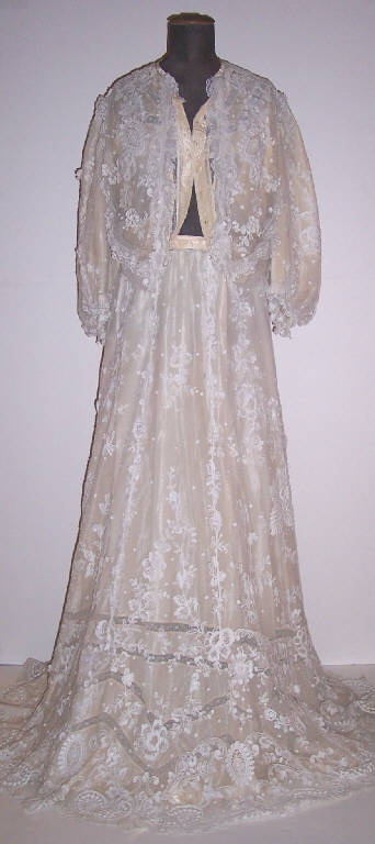 Abito composto da gonna e corpetto in pizzo color avorio ricamato ad ago con motivi floreali; sottogonna in seta avorio con inserti di pizzo; allacciatura anteriore del corpetto; maniche lunghe ed ampie.