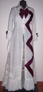 Abito in mussola di lino bianco; decorazioni e fiocchi in velluto viola; allacciatura anteriore con bottoni; colletto rotondo; maniche lunghe; balza plissettata al bordo; tripla balza plissettata ai polsini; sottogonna in garza color avorio.
