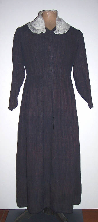 Abito in tela grezza di cotone blu; corpino foderato con tela grezza color panna; manica lunga; collo rotondo; apertura anteriore.