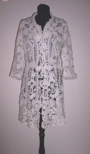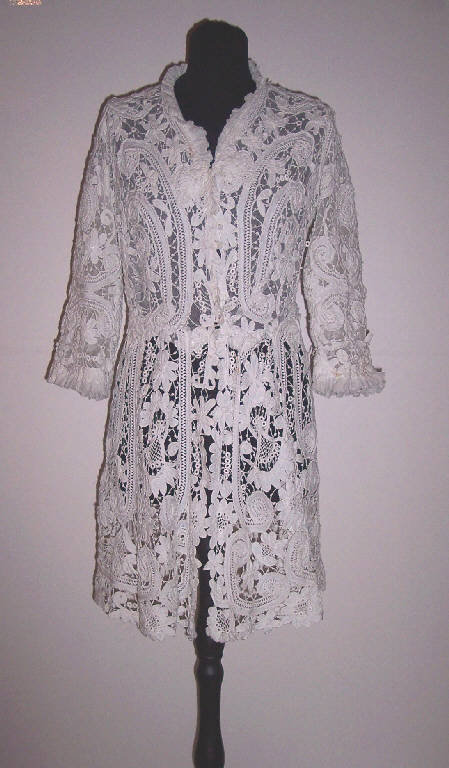 Giacca lunga in tulle bianco ricoperto da pizzo a lavorazione Irlanda eseguito a rilievo con fettuccia e cordoncino realizzati ad ago e ad uncinetto; manica lunga; allacciatura anteriore.