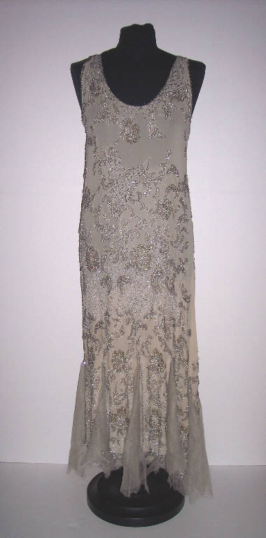 Abito senza maniche in tulle di seta beige, interamente ricamato ad ago con perline, vetri argentati, filo metallico, paillettes.