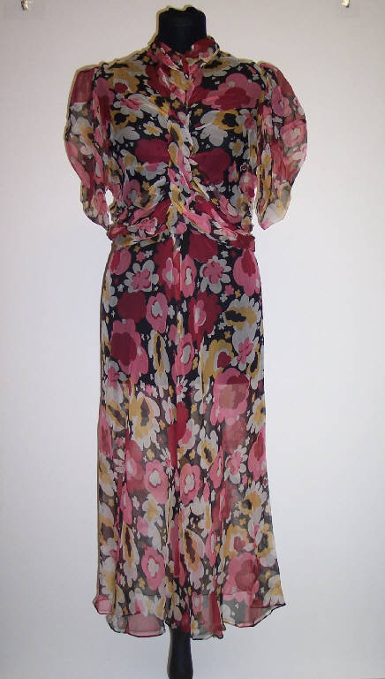 Abito in chiffon di seta policromo con motivi florali; manica a palloncino; foulard applicato al collo; arricciatura a treccia nella parte anteriore del corpino.