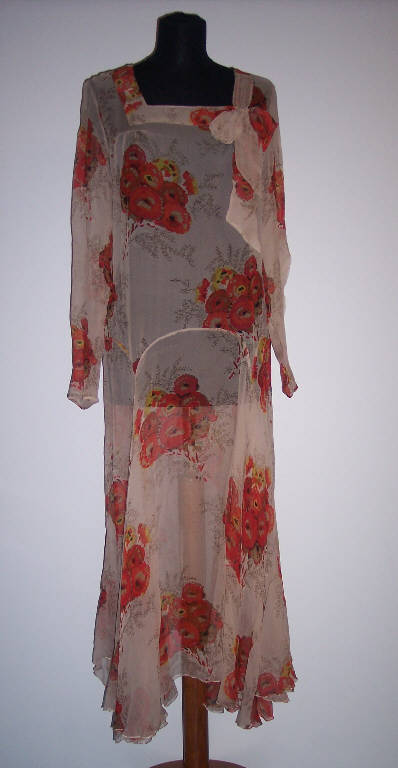 Abito in chiffon di seta policromo con motivi florali su fondo beige; scollatura quadrata e fiocchetto; manica lunga.