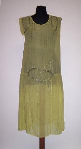 Abito in voile di seta verde senza maniche; vita ribassata; scollatura a "V"; perline applicate della stessa tonalità dell'abito.