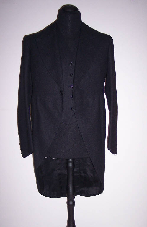 Giacca, parte del completo, in panno di lana grigio antracite; fodera in seta nera; corta nella parte anteriore e più lunga in quella posteriore. Sulla tasca interna destra è applicata l'etichetta "Sartoria Vecchio Giuseppe di Paride e Mario Vecchio Pavia".