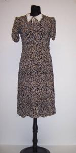 Abito in seta policroma con motivi floreali su fondo nero; manica corta; colletto staccabile in cotone bianco; allacciatura anteriore del corpino con bottoncini rivestiti dello stesso tessuto dell'abito; apertura sul fianco sinistro con bottoncini automatici.