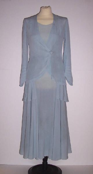 Completo da sposa composto da abito scamiciato e casacca in organza di seta azzurra.