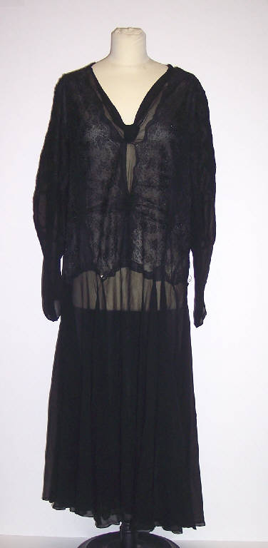 Abito in chiffon di seta nero; maniche lunghe; inserti di pizzo nero sul corpetto; scollatura a "V"; piccole arricciature sul corpetto.