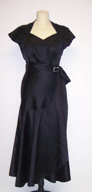 Abito in raso di seta nero senza maniche; scollatura a cuore; gonna tagliata di sbieco con ampio spacco; cintura con fibbia gioiello; allacciatura con cerniera sul fianco sinistro.