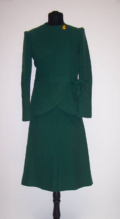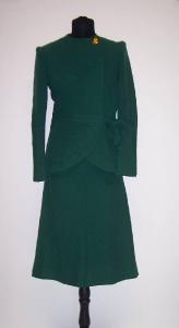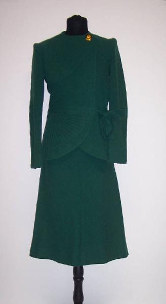 Completo composto da gonna e giacca in lana verde.
