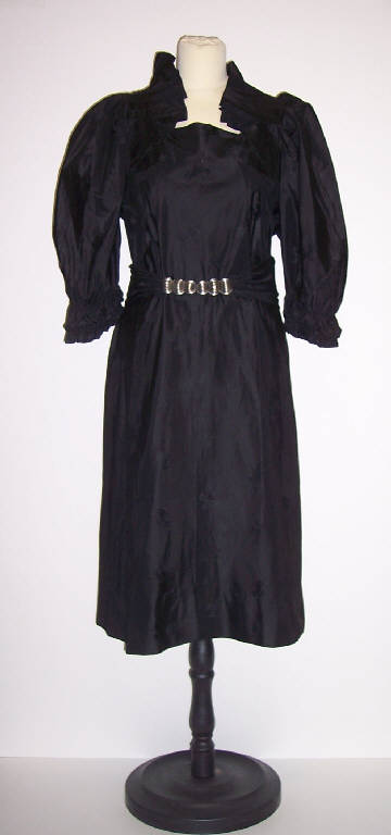 Abito in taffetà di seta nera con decorazioni a motivi floreali tono su tono; manica a 3/4 con spalle a sbuffo; scollatura quadrata; cerniera sul fianco sinistro; cintura dello stesso tessuto con chiusura a borchie d'argento.