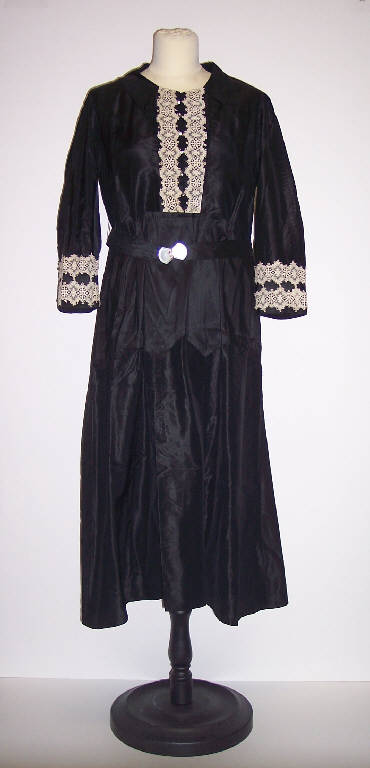 Abito in seta nera; manica lunga; gonna con larghe plissettature; pettorina anteriore e polsini decorati con strass e pizzo color avorio applicato; cintura in vita con fibbia in madreperla. Corpino foderato in cotone bianco; apertura anteriore del corpino con bottoni automatici.