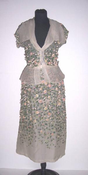 Completo composto da gonna e casacca in organza di seta color écru con applicazioni di fiori a rilievo su tutta la superficie.