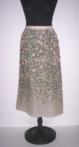 Gonna, parte del completo, in organza di seta color écru ricamata ad ago con applicazioni di fiori a rilievo di color rosa su tutta la superficie; fodera di organza color écru.