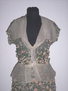 Casacca, parte del completo, in organza di seta color écru ricamata ad ago con applicazioni di fiori a rilievo di color rosa su tutta la superficie; maniche corte; allacciatura anteriore con bottoni a perla; sfoderato.