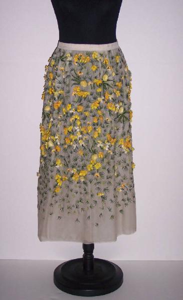 Gonna, parte del completo, in organza di seta color écru ricamata ad ago con applicazioni di fiori a rilievo di color giallo su tutta la superficie; lunghezza al ginocchio.