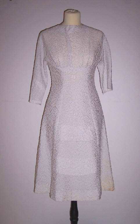 Abito corto, parte del completo da sposa, in seta operata bianca; vita alta; maniche a 3/4; collo rotondo; plissettatura sotto il seno; allacciatura posteriore con cerniera.