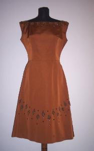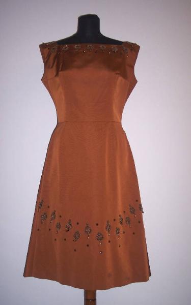 Abito scamiciato in seta color rame; scollatura a barchetta, profonda sulla schiena; arricciatura posteriore nella zona del girovita; corallini applicati al collo e alla parte inferiore della gonna.