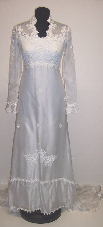 Abito da sposa in naylon bianco con strascico; maniche lunghe; decorazioni floreali applicate sul corpino e sulla gonna; allacciatura posteriore con bottoni.