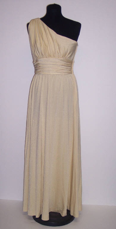 Abito in jersey sintetico color avorio con una sola spalla; vita alta con fascia arricciata; brevetto adesivo per la scollatura.