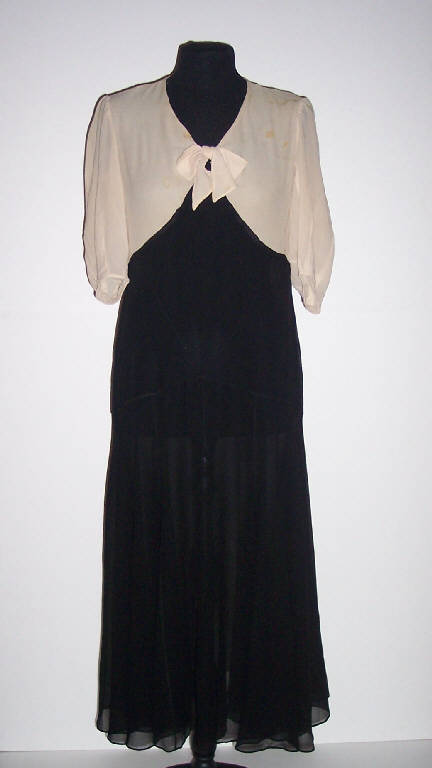 Abito in chiffon di seta bicolore: corpetto beige e gonna nera; maniche corte; fiocco nella parte anteriore del corpetto.