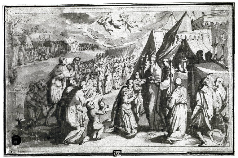 Guerriero riceve l'eucarestia da un papa in un accampamento