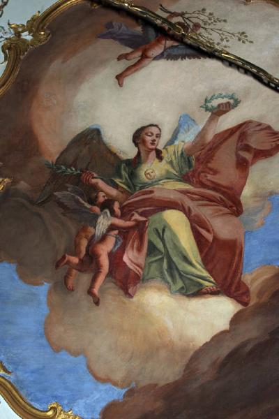 Medaglione sagomato entro cornice mistilinea in stucco dorato rococò, decorata da fiori policromi. Al centro in un nimbo campeggia una figura femminile alata allegorica (Niche ?) che tiene nella sinistra una corona d'alloro e nella destra un ramo d'ulivo. Tre putti completano la scena: due sorreggono il manto rosso della donna e uno in cielo tiene tra le mani un ramo. Sul petto della donna risplende un sole con sembianze umane.