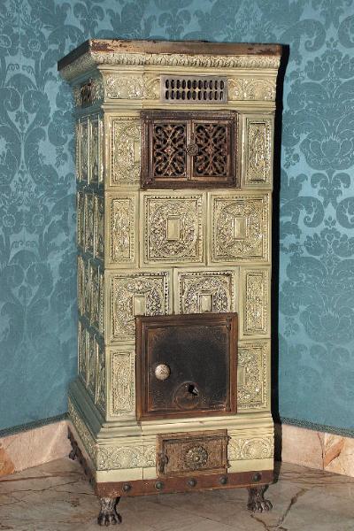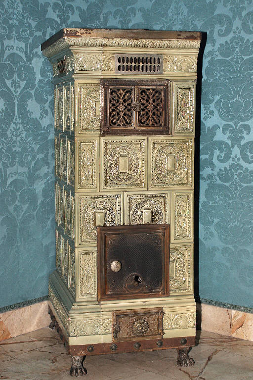 Stufa rivestita con piastrelle in maiolica color avorio, decorate da rameggi vegetali e motivi geometrici; poggia su piedi leonini ed è dotata di quattro sportelli metallici per l'alimentazione e l'areazione.