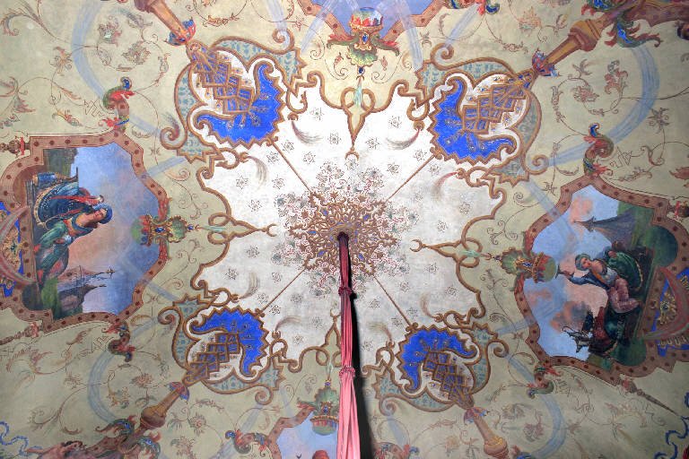 Volta con decoro "a padiglione", completamente affrescata con motivi a grottesche di ispirazone orientale, con racemi e volute; al centro 4 medaglioni con figure maschili in abiti orientali, fumatori di narghilè, alternati a medaglioni sorretti da due odalische recanti al centro mazzi di fiori. Lungo tutto il perimetro, in corrispondenza dell'imposta della volta, corre un motivo decorativo a festone con nappe ("fregio a mantovana") con profilo in stucco sagomato, quasi a simulare l'interno della tenda di un sultano.