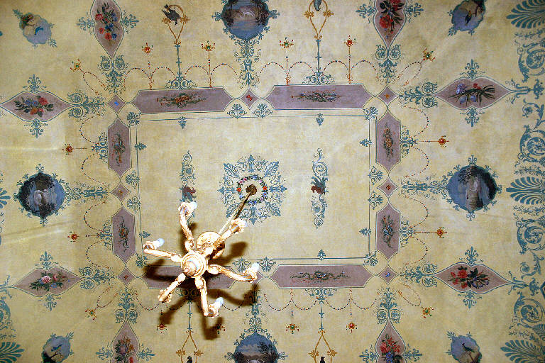 Decorazione policroma a pompeiane della volta a padiglione con cigni e uccellini in a medaglioni con sfondo paesaggistico, alternati a ovali con fiori su fondo rosa e festoni con perle e volute. Al centro riquadratura con strumenti musicali in cartelle rosa, alternate a farfalle. Alla base lungo tutto il perimetro, motivi a volute e palmette azzurre concluso da un festone a trompe l'oeil che finge una frangia con perle.