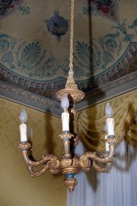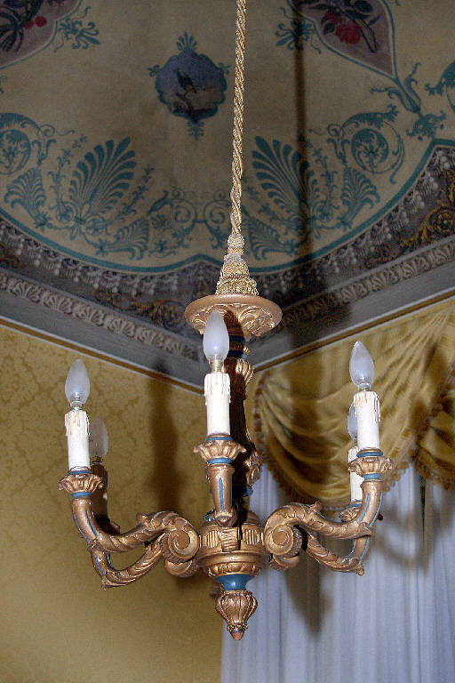 Lampadario in legno dorato a sei bracci con volute e motivi decorativi dipinti in azzurro.