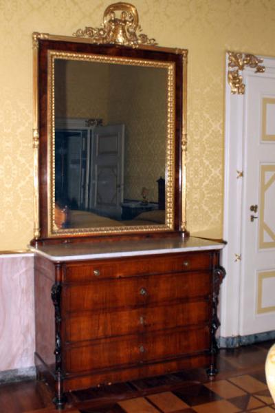 Cassettone a quattro cassetti decorati a intarsio con racemi e volute, piano in marmo bianco; lungo gli spigoli laterali ghirlande di frutta scolpite e piedi a cipolla. Il cassettone è completato da una specchiera con doppia cornice dorata sormontata da due busti scolpiti intrecciati che decorano il fastigio.