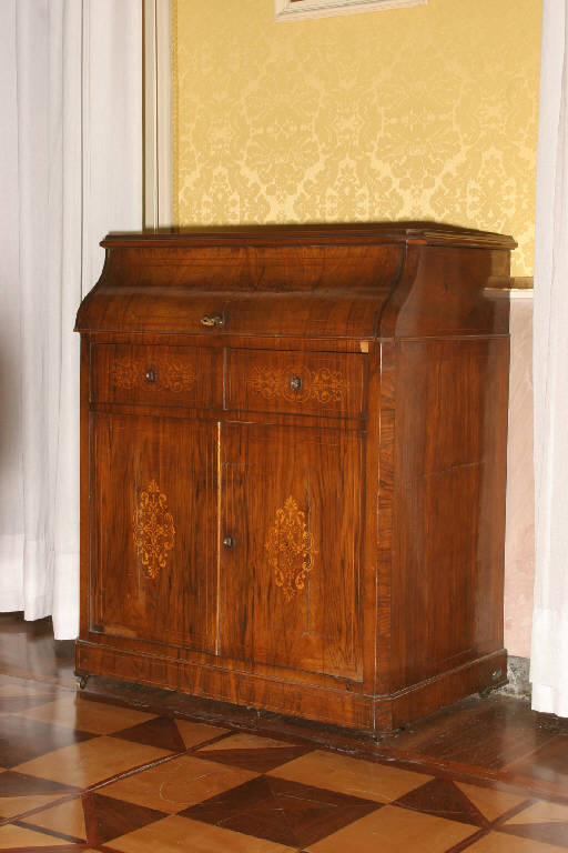 Scrittoio con alzata a ribalta, due cassetti e due ante. Al centro delle due ante e sui cassetti il mobile reca motivi decorativi a volute e racemi ad intarsio ligneo.